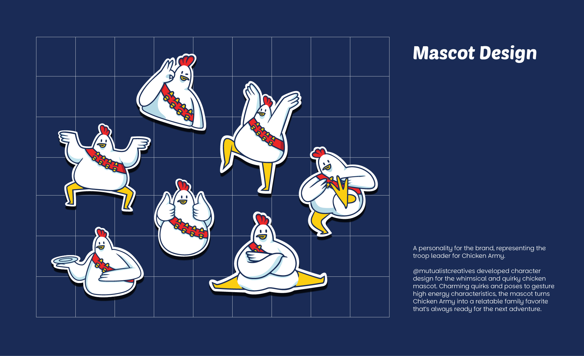 During our development stages, Mutualist decided that we wanted a personality, not just a logo. That’s why we developed a fun chicken mascot, each designed with unexpected quirks & high energy characteristics.
